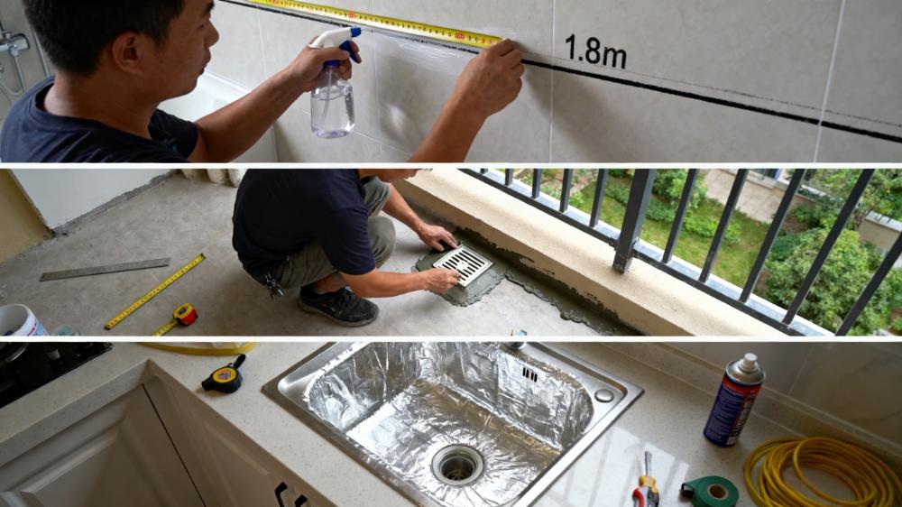 防水做完别着急收尾,验收合格才算数!地面做闭水试验,倒 2 厘米深的水静置24小时,去楼下看对应区域,没渗水痕迹才合格;墙面用喷壶喷水,静置半天后摸墙面,没有潮湿感说明防水有效。