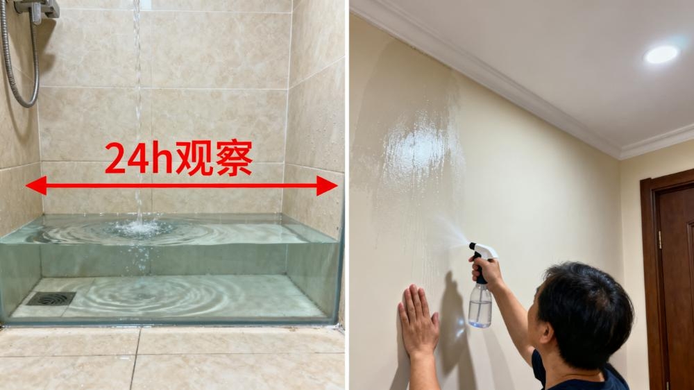 防水做完别着急收尾,验收合格才算数!地面做闭水试验,倒 2 厘米深的水静置24小时,去楼下看对应区域,没渗水痕迹才合格;墙面用喷壶喷水,静置半天后摸墙面,没有潮湿感说明防水有效。